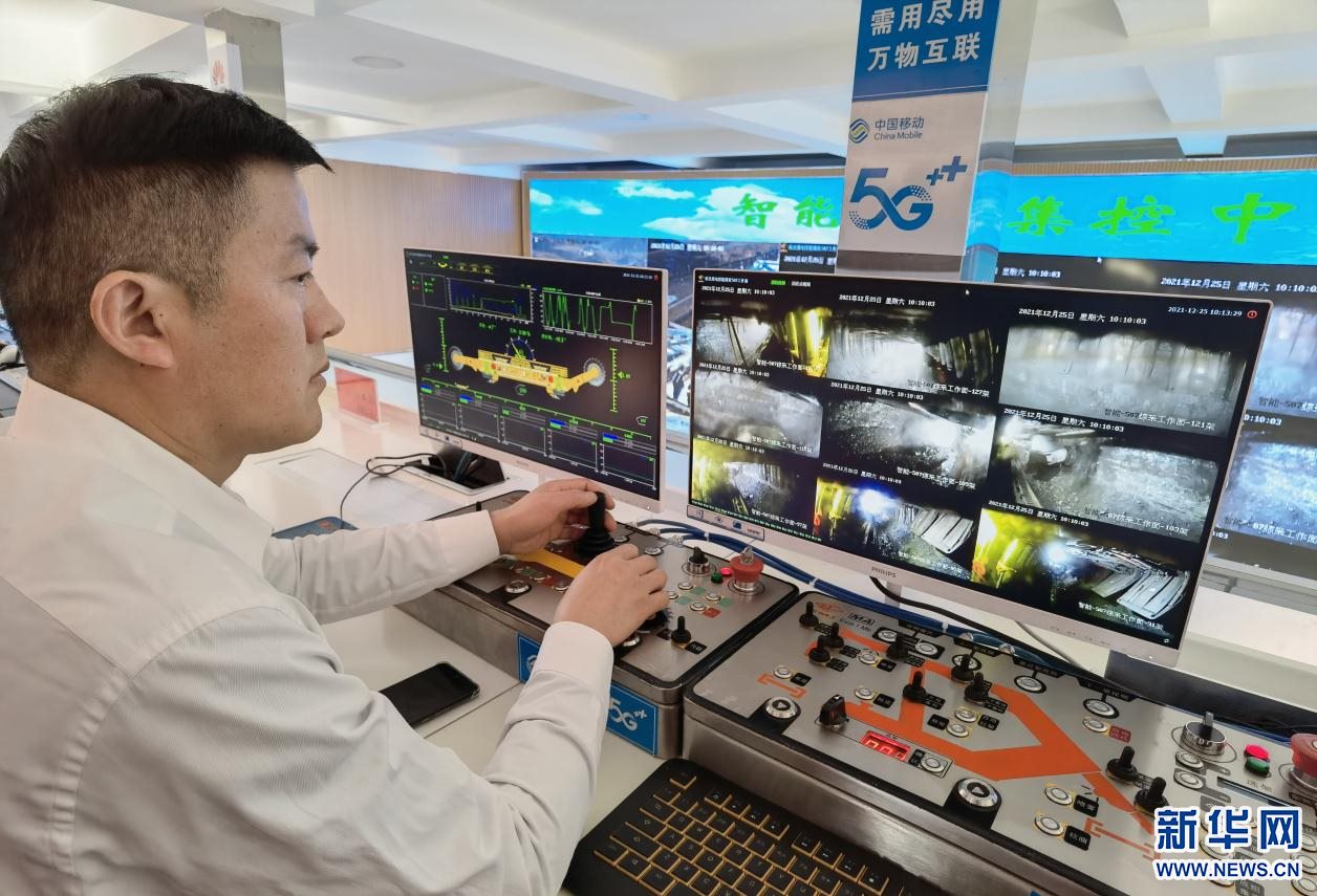 在智能調(diào)度集控中心,1名井下采煤掘進機司機坐在辦公室里,看著顯示器上實時回傳的井下畫面,手握操縱桿遠距離控制井下的采煤掘進機進行掘采。據(jù)介紹,智能集控中心僅需8個人,就可以幫助煤礦實現(xiàn)全年800萬噸產(chǎn)量。