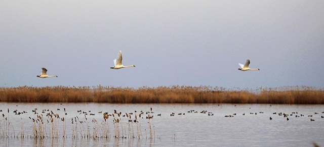 蘆葦蕩漾,鴻雁飛翔。此刻,鳥類攝影愛好者馬海明扛起他的相機(jī),駕著破冰艇駛向?yàn)趿核睾5纳钐?。他平靜地說:“再過些日子,這里的鳥更多、魚更歡,拍出來的照片會更美更精彩?!?/p>