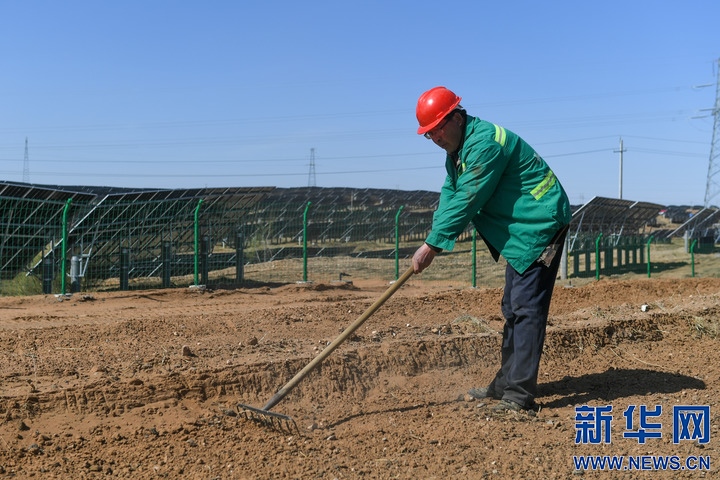 4月12日,郭軍在內(nèi)蒙古鄂爾多斯市布爾臺沉陷區(qū)的光伏板旁勞作。新華社記者 貝赫 攝