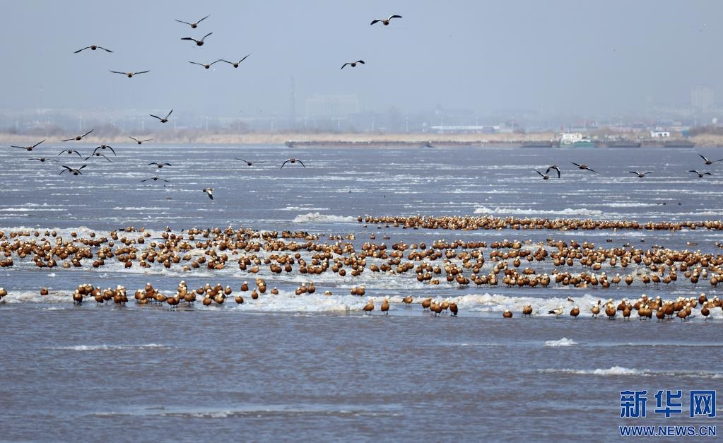 2021年11月27日,在內(nèi)蒙古鄂爾多斯市達(dá)拉特旗,成群的候鳥(niǎo)棲息在剛剛封凍的黃河冰面上。新華社記者賈立君 攝