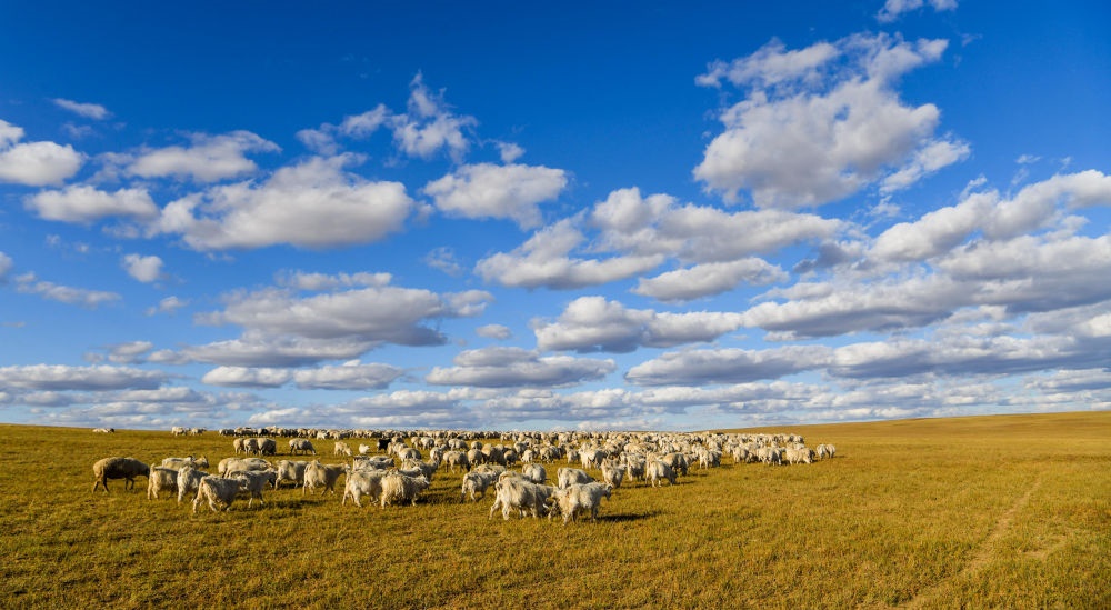 內蒙古錫林浩特市寶力根蘇木上的羊群在覓食(2017年9月16日攝)。新華社記者連振攝