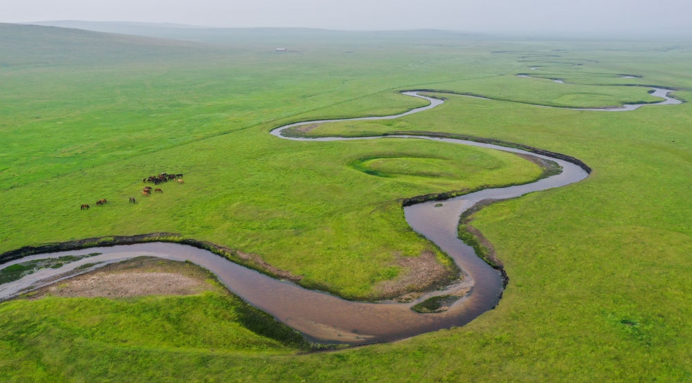 這是內蒙古錫林郭勒盟東烏珠穆沁旗乃林高勒的草原風光(2021年7月12日攝,無人機照片)。新華社記者連振攝