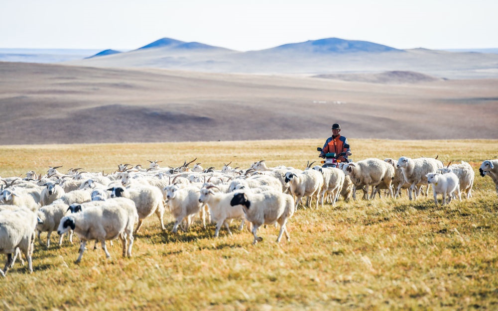 內蒙古錫林浩特市寶力根蘇木牧民瑪吉格的兒子鋼蘇格拉在草原上放羊(2017年9月16日攝)。新華社記者連振攝