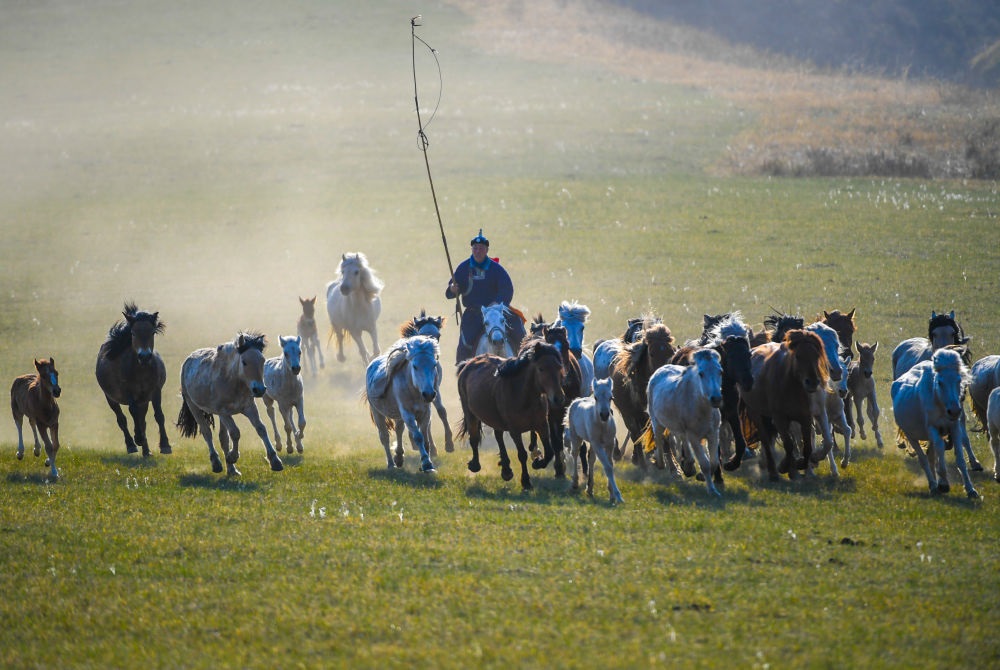 內蒙古錫林郭勒盟西烏珠穆沁旗的牧民在驅趕馬群(5月17日攝)。新華社記者彭源攝