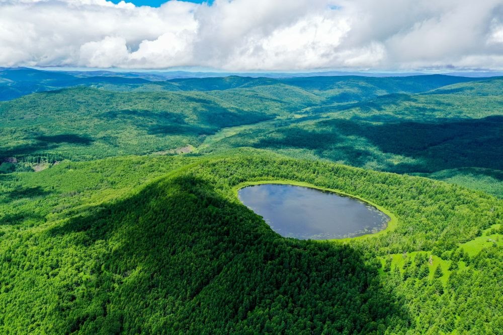 這是內蒙古阿爾山天池風光(2021年7月14日攝,無人機照片)。新華社記者連振攝