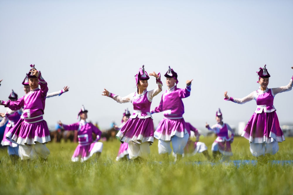 表演者在錫林浩特市游牧文化節(jié)·白音錫勒牧場建場70周年那達慕開幕式上表演傳統(tǒng)舞蹈(2020年8月2日攝)。新華社記者彭源攝