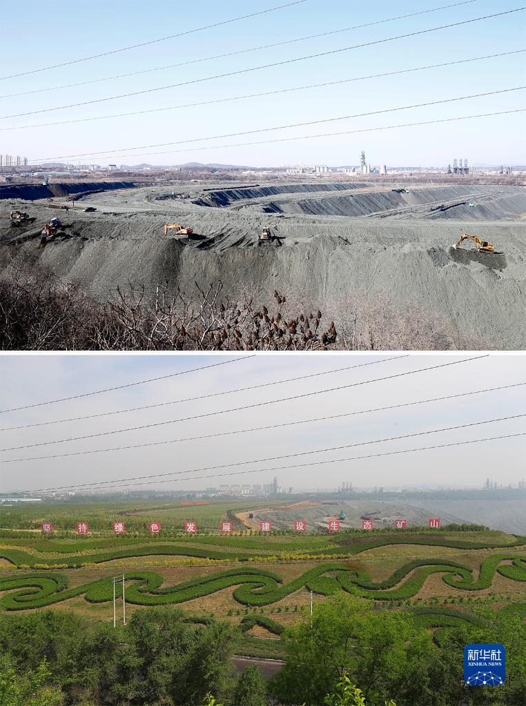 這是一張拼版照片:上圖為遼寧省撫順市西露天礦部分區(qū)域生態(tài)恢復(fù)前的場(chǎng)景(2019年3月6日攝,資料照片);下圖為2022年6月2日拍攝的遼寧省撫順市西露天礦部分區(qū)域生態(tài)恢復(fù)后的場(chǎng)景(新華社記者楊青攝,無(wú)人機(jī)照片)。新華社發(fā)
