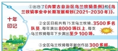 黨的十八大以來,烏蘭牧騎事業(yè)發(fā)展進(jìn)入快車道。自治區(qū)制定了一系列加快推進(jìn)烏蘭牧騎事業(yè)發(fā)展的政策,出臺了《內(nèi)蒙古自治區(qū)烏蘭牧騎條例》和《烏蘭牧騎事業(yè)中長期發(fā)展規(guī)劃(2021-2030年)》。設(shè)立全區(qū)烏蘭牧騎事業(yè)發(fā)展專項(xiàng)經(jīng)費(fèi),為75支烏蘭牧騎配備演出大巴車,新建烏蘭牧騎宮,舉辦烏蘭牧騎藝術(shù)節(jié)、全區(qū)烏蘭牧騎新人新作比賽,開展全區(qū)烏蘭牧騎交流演出、“烏蘭牧騎月”等活動,促進(jìn)烏蘭牧騎互相學(xué)習(xí)發(fā)展。開發(fā)“網(wǎng)上烏蘭牧騎”PC版網(wǎng)頁和手機(jī)版微信H5,成立烏蘭牧騎輔導(dǎo)工作隊(duì)、志愿服務(wù)工作隊(duì),為基層農(nóng)牧民提供藝術(shù)培訓(xùn)服務(wù)。以“烏蘭牧騎+”的方式深入基層,開展理論宣講、電影放映、法律咨詢等綜合志愿服務(wù)。加強(qiáng)烏蘭牧騎人才隊(duì)伍建設(shè),在錫林郭勒職業(yè)學(xué)院等設(shè)立烏蘭牧騎人才培訓(xùn)基地,舉辦全區(qū)烏蘭牧騎隊(duì)長培訓(xùn)班、舞臺藝術(shù)創(chuàng)作培訓(xùn)班等業(yè)務(wù)培訓(xùn)班。組織實(shí)施《烏蘭牧騎原創(chuàng)經(jīng)典作品名錄》工作和《全區(qū)烏蘭牧騎原創(chuàng)經(jīng)典作品傳承工程》。編輯出版《烏蘭牧騎回憶錄》《烏蘭牧騎優(yōu)秀作品選》。組織啟動烏蘭牧騎知識產(chǎn)權(quán)保護(hù)工作。