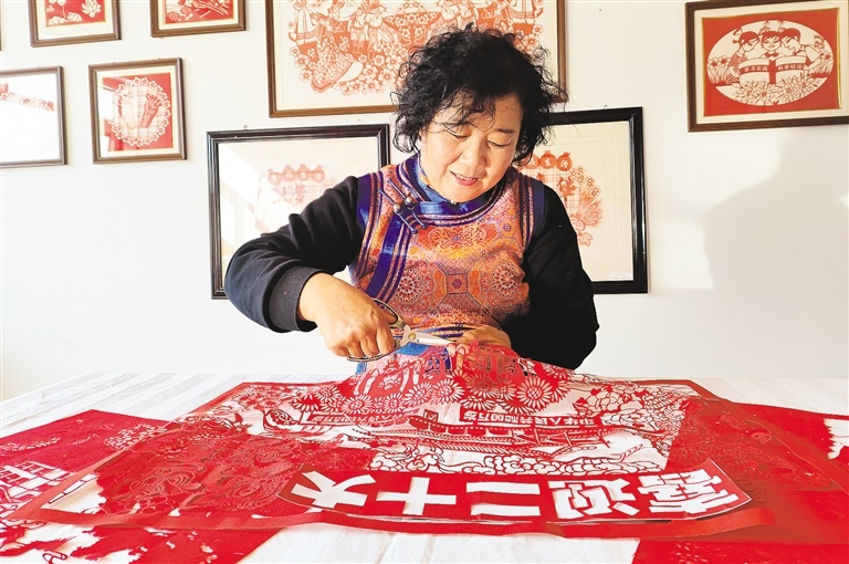 10月15日下午,自治區(qū)非遺剪紙項目傳承人、呼和浩特市土默特左旗畢克齊鎮(zhèn)紅秀剪紙合作社發(fā)起人李還秀在創(chuàng)作慶祝黨的二十大勝利召開系列剪紙作品。連日來,全區(qū)各地群眾通過剪紙、書法等藝術(shù)形式,表達(dá)對盛會的期盼、對祖國的祝福。記者 鄭學(xué)良 實習(xí)生 郭亞麗 攝