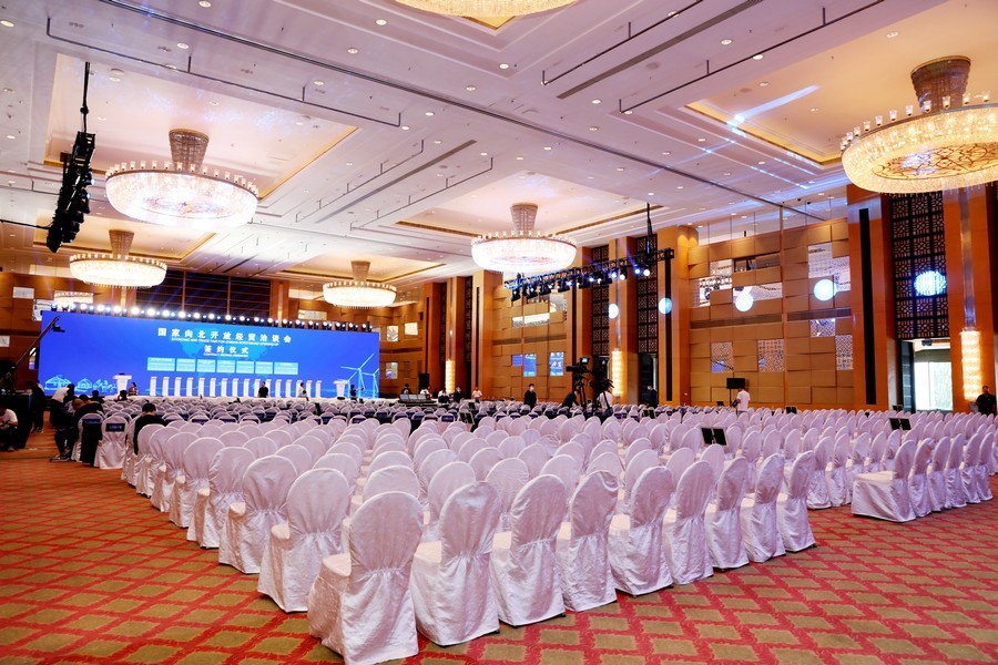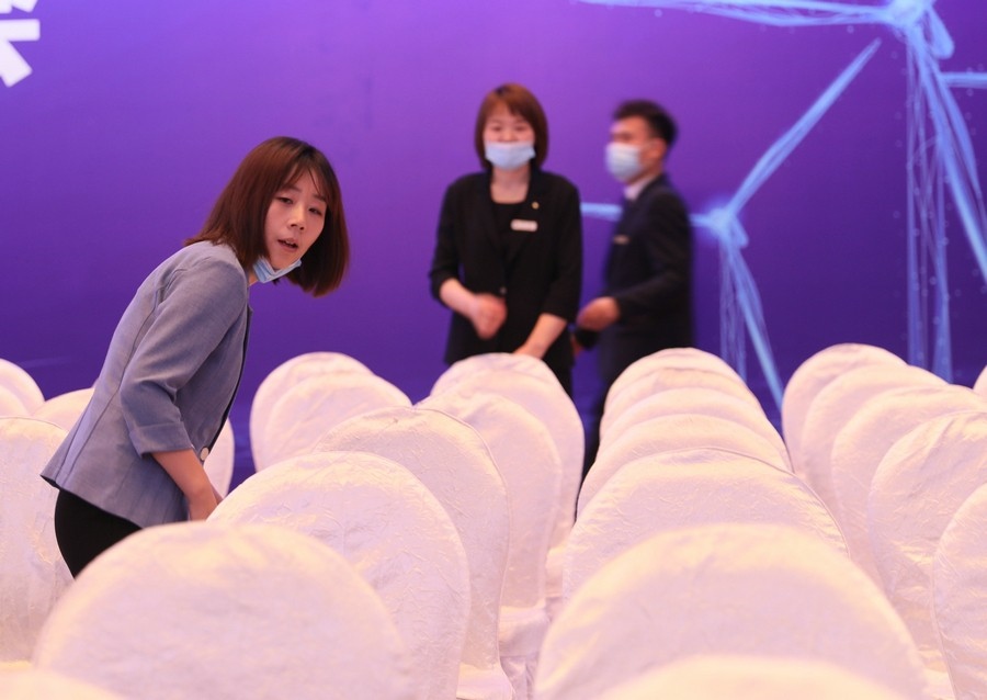會場基本布置完畢,工作人員正在進行流程彩排