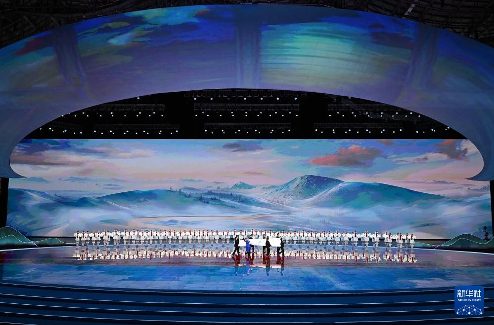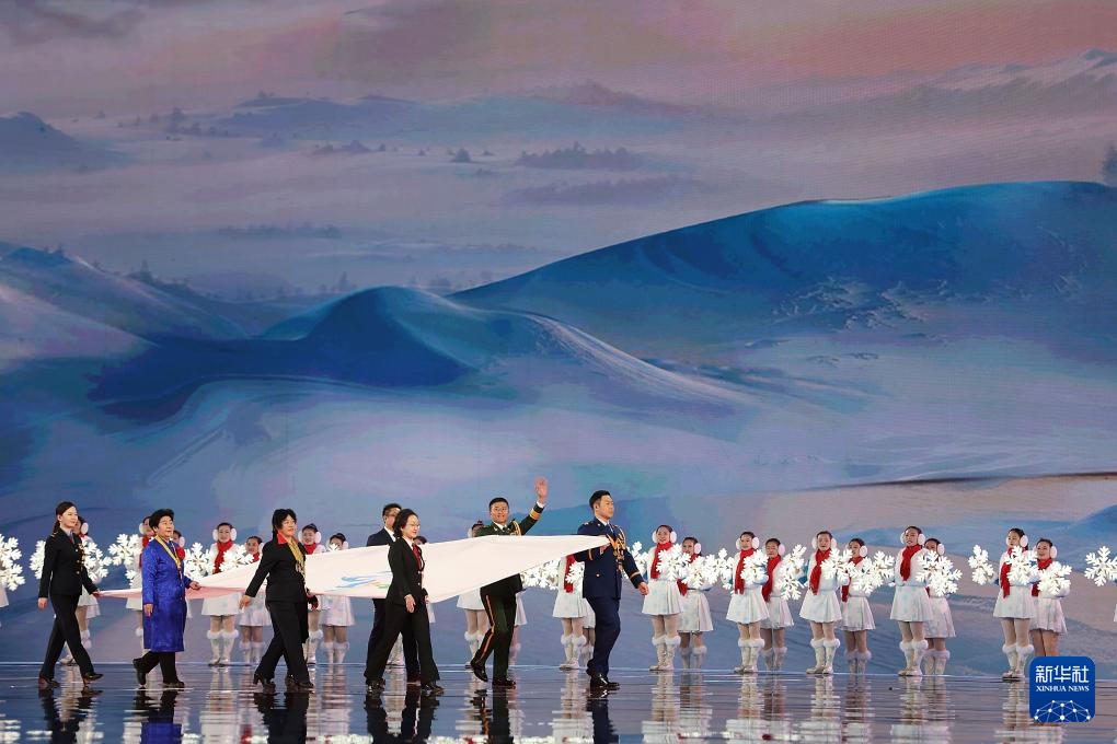 ??2月17日,中華人民共和國第十四屆冬季運(yùn)動會會旗入場。新華社記者 連振 攝