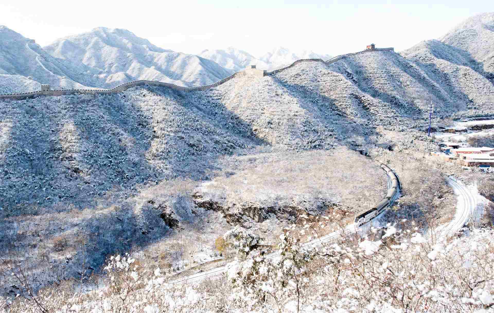 白雪皚皚,北京居庸關(guān)長(zhǎng)城銀裝素裹綿延于山脊之上。山腳下,S2線列車(chē)迎面而來(lái)穿越雪海。