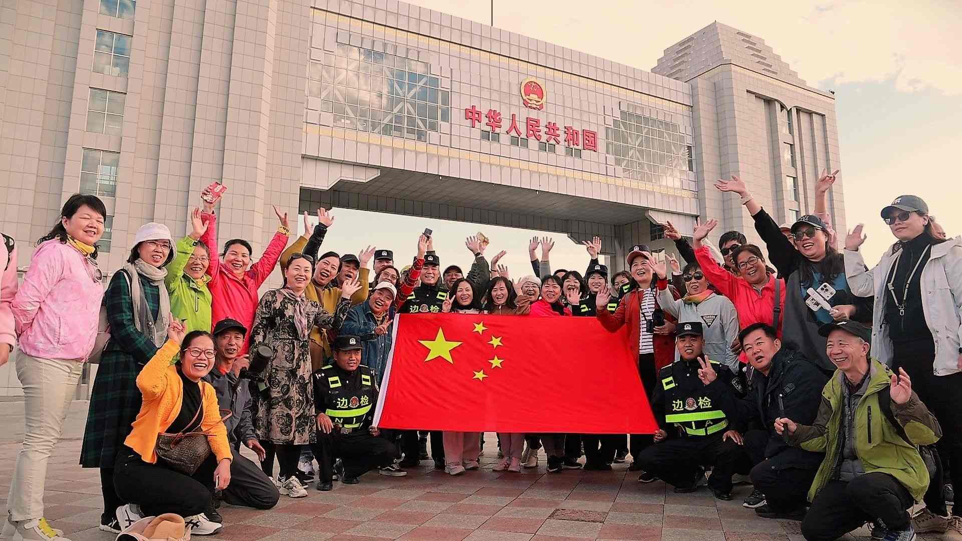 游客在滿洲里國門下合影。李新軍攝