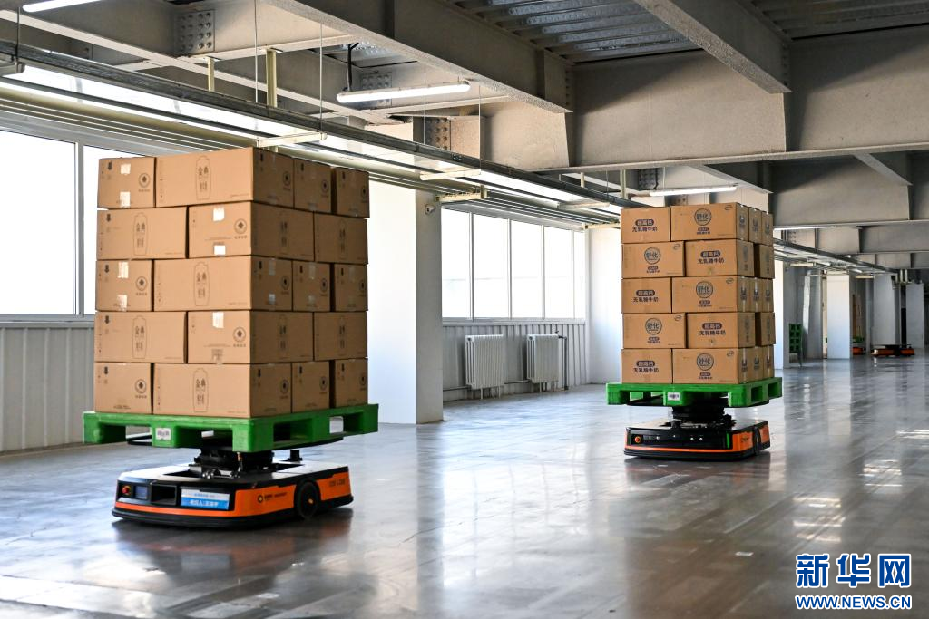 1月9日,在呼和浩特市伊利現(xiàn)代智慧健康谷液態(tài)奶全球智造標(biāo)桿基地,AGV智能搬運(yùn)機(jī)器人在運(yùn)送奶制品。
