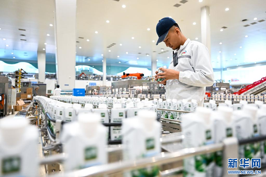 1月9日,在呼和浩特市伊利現(xiàn)代智慧健康谷液態(tài)奶全球智造標(biāo)桿基地,工人在生產(chǎn)線上檢查奶制品包裝情況。