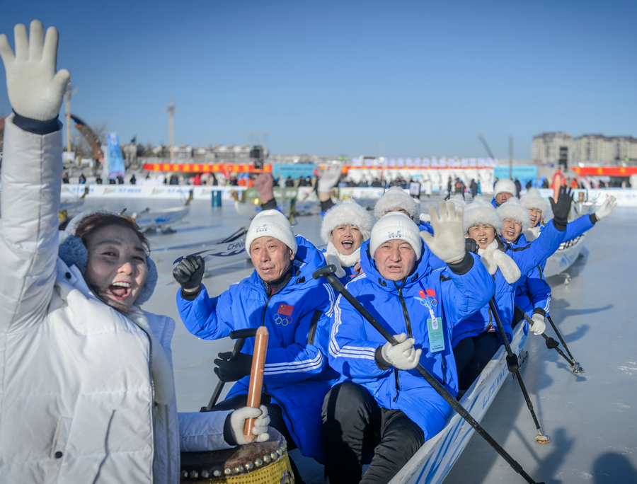 冰上龍舟作為傳統(tǒng)龍舟運動的創(chuàng)新變體,將場地移至冰面,船體保留了龍舟的基本構(gòu)造元素,同時底部裝有冰刀或滑輪以適應(yīng)冰面滑行。這項運動融合了競技性、團隊性與娛樂性,讓參與者在冰面上體驗風(fēng)馳電掣的刺激,能夠極大地激發(fā)了人們的冰雪運動熱情。