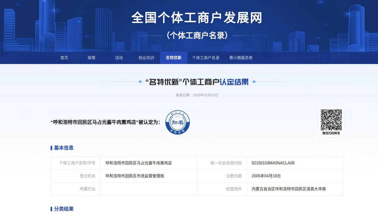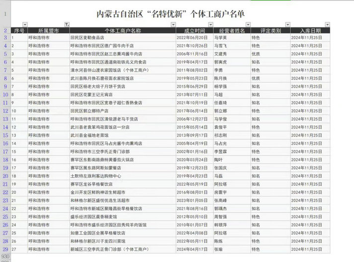 去年,呼和浩特市市場監(jiān)管局等16個(gè)市級(jí)部門聯(lián)合制定實(shí)施《呼和浩特市個(gè)體工商戶分型分類實(shí)施方案(試行)》,開展“名特優(yōu)新”個(gè)體工商戶申報(bào)和推薦工作。通過線上線下雙渠道,利用個(gè)體工商戶服務(wù)月活動(dòng),向廣大個(gè)體工商戶普及申報(bào)政策和流程,鼓勵(lì)符合條件的個(gè)體工商戶參與申報(bào)。通過材料審核、走訪核實(shí)、征求意見、評(píng)審認(rèn)定、信息公示等程序,經(jīng)區(qū)縣、市、自治區(qū)逐級(jí)復(fù)核上報(bào),呼和浩特市首批認(rèn)定全國“名特優(yōu)新”的27戶個(gè)體工商戶已完成入庫(其中“知名”15戶、“特色”10戶、“優(yōu)質(zhì)”2戶),被認(rèn)定的個(gè)體工商戶可享受由國家、自治區(qū)、市出臺(tái)的相關(guān)扶持培育政策。