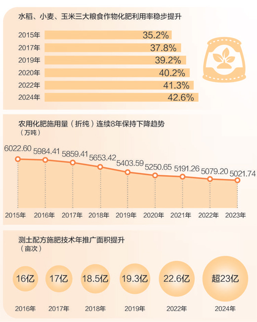 2024年,我國水稻、小麥、玉米三大糧食作物化肥利用率為42.6%,比2022年提高1.3個百分點?;世寐剩椿时蛔魑镂绽玫谋壤?,反映了化肥在農業(yè)生產中的有效利用程度。科學施肥效果提升,折射農業(yè)發(fā)展方式之變。