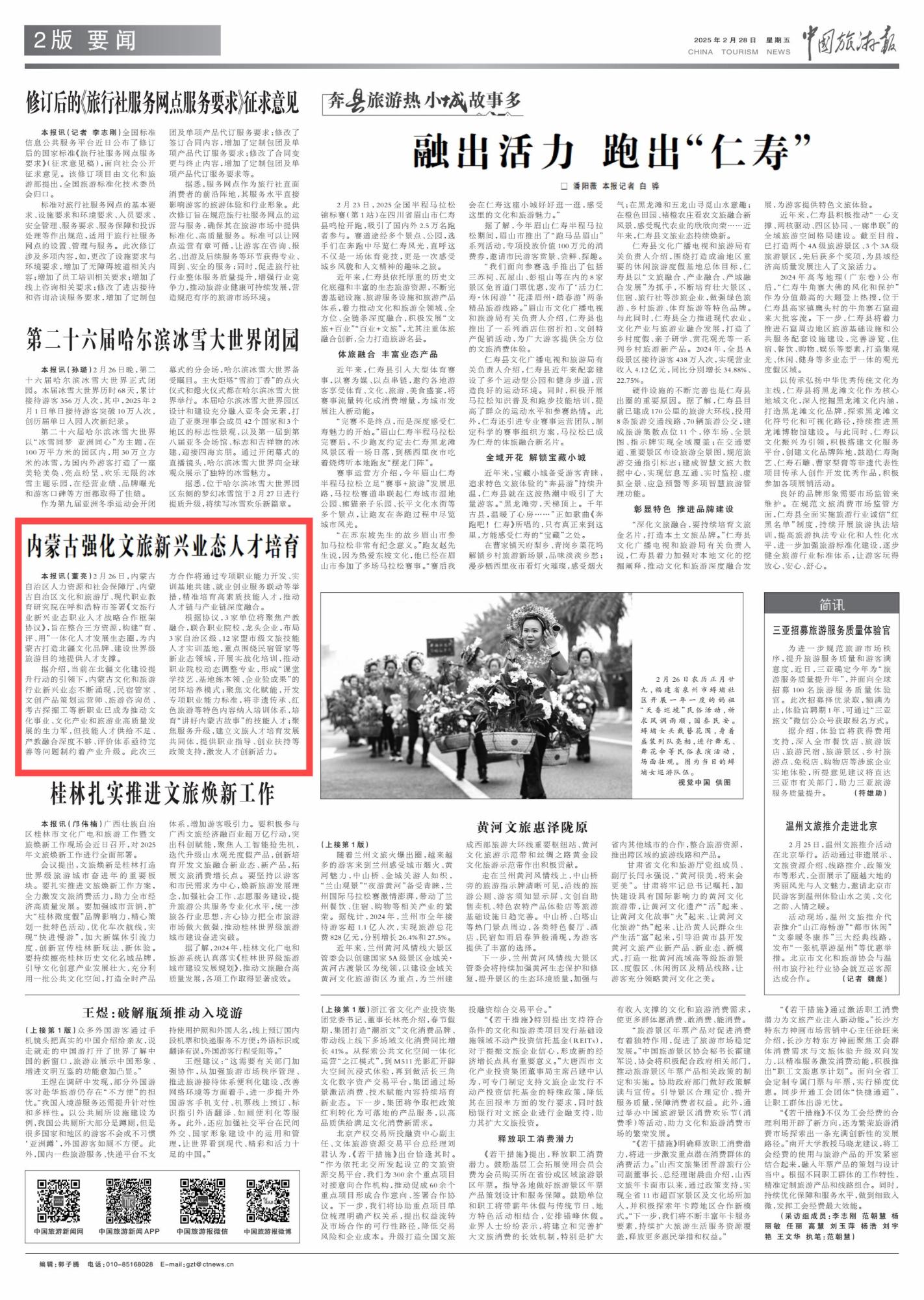 2015年2月28日,《中國旅游報》第2版刊發(fā)題為《內(nèi)蒙古強化文旅新興業(yè)態(tài)人才培育》的消息,報道了內(nèi)蒙古整合三方資源,構(gòu)建“育、評、用”一體化人才發(fā)展生態(tài)圈,為內(nèi)蒙古打造北疆文化品牌、建設世界級旅游目的地提供人才支撐。