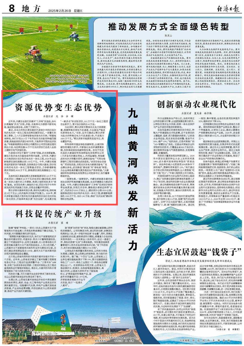2025年2月26日,《經(jīng)濟(jì)日?qǐng)?bào)》第8版刊發(fā)題為《資源優(yōu)勢(shì)變生態(tài)優(yōu)勢(shì)》的文章,報(bào)道了近年來(lái),內(nèi)蒙古全面打好黃河“幾字彎”攻堅(jiān)戰(zhàn),如今沙漠瀚?!帮L(fēng)光”無(wú)限,風(fēng)能、光能轉(zhuǎn)化為源源不斷的電能,輸送到全國(guó)各地,點(diǎn)亮了萬(wàn)家燈火。