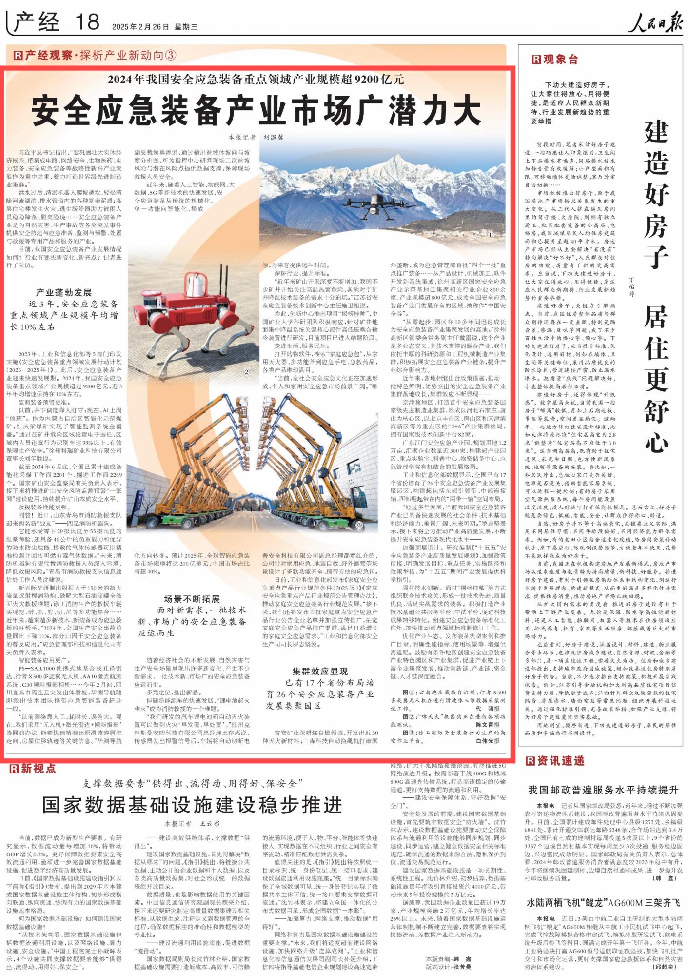 2025年2月26日,《人民日報》第18版刊發(fā)題為《2024年我國安全應(yīng)急裝備重點領(lǐng)域產(chǎn)業(yè)規(guī)模超9200億元 安全應(yīng)急裝備產(chǎn)業(yè)市場廣潛力大》的報道,2024年,我國安全應(yīng)急裝備重點領(lǐng)域產(chǎn)業(yè)規(guī)模超過9200億元,其中,內(nèi)蒙古自治區(qū)紅慶梁煤礦實現(xiàn)了智能監(jiān)測系統(tǒng)全覆蓋。