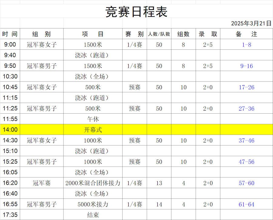 比賽項目包括男女500米、1000米、1500米以及接力賽等多個項目。