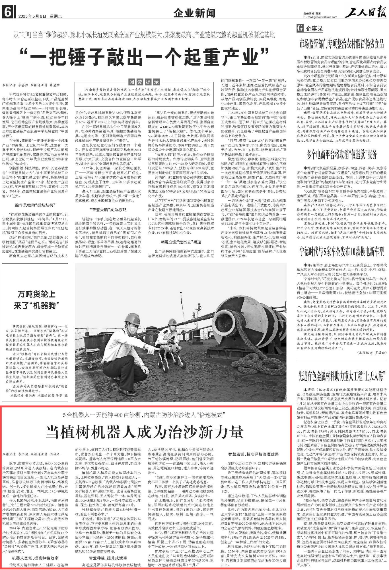 2025年5月6日,《工人日?qǐng)?bào)》第6版刊發(fā)題為《當(dāng)植樹機(jī)器人成為治沙新力量》的文章,報(bào)道了內(nèi)蒙古作為我國(guó)防沙治沙主戰(zhàn)場(chǎng),承擔(dān)著“三北”工程六期60%的治沙任務(wù)。隨著防沙治沙的深入推進(jìn),智能植樹機(jī)器人、多功能立體固沙車、可降解容器等“黑科技”已經(jīng)推廣應(yīng)用,內(nèi)蒙古防沙治沙進(jìn)入“倍速模式”。