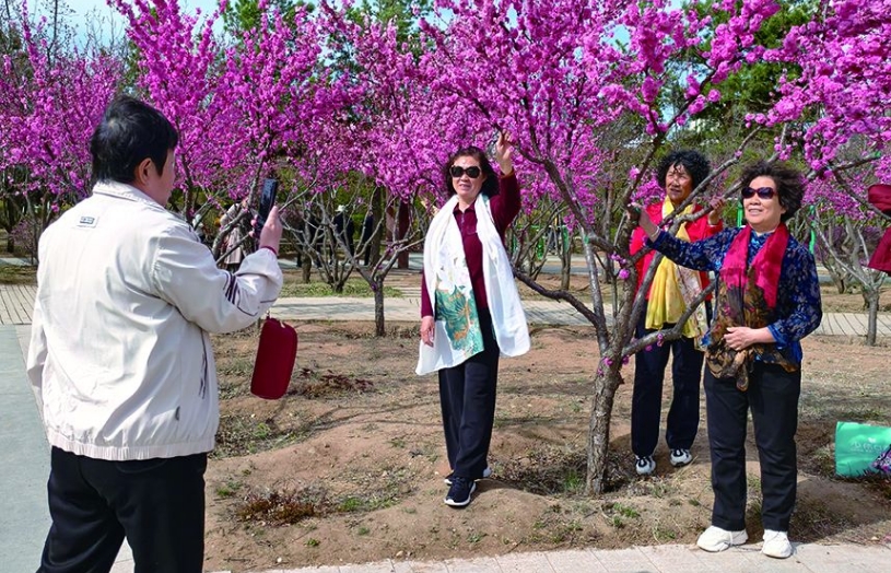 走進(jìn)植物園,道路兩側(cè)的榆葉梅競相綻放,粉紅色的花朵層層疊疊掛滿枝頭,形成一片爛漫花海。從浙江來的游客李筱正用手機記錄美景:“原本擔(dān)心錯過北方花期,沒想到這里的榆葉梅開得這么漂亮,完全不輸江南的春天?!?/p>