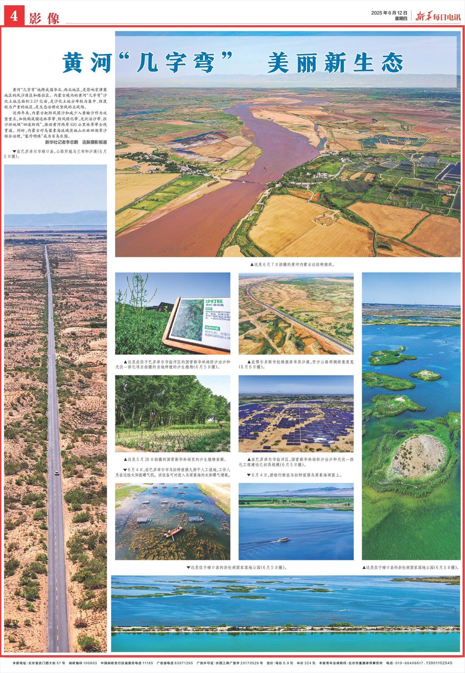 2025年6月12日,《新華每日電訊》第4版刊發(fā)題為《黃河“幾字彎” 美麗新生態(tài)》一文,報(bào)道了黃河“幾字彎”地跨我國(guó)華北、西北地區(qū),是影響京津冀地區(qū)的風(fēng)沙源區(qū)和路徑區(qū)。內(nèi)蒙古加快構(gòu)筑鎖邊林草帶、防風(fēng)綠化帶、光伏治沙帶、攔沙淤地壩“四道防線”,推動(dòng)黃河兩岸620公里林草帶全線貫通。