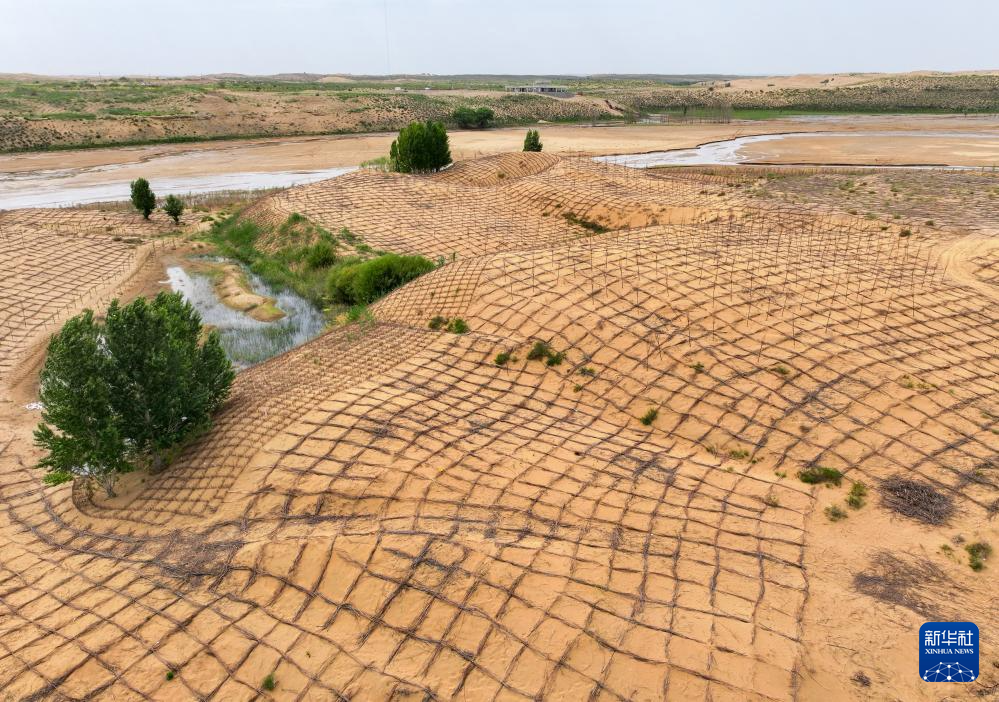 6月7日,在鄂爾多斯市達(dá)拉特旗境內(nèi)的庫(kù)布其沙漠,工人在治沙(無人機(jī)照片)新華社記者 李志鵬 攝