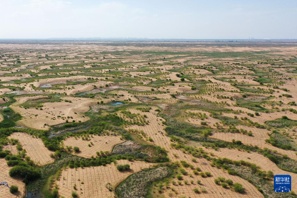 這是6月6日拍攝的鄂爾多斯市杭錦旗境內(nèi)庫(kù)布其沙漠中的一處綠洲(無人機(jī)照片)新華社記者 李志鵬 攝