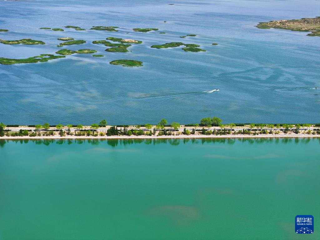 6月5日,在巴彥淖爾市磴口縣奈倫湖國(guó)家濕地公園,摩托艇行駛在湖面上(無人機(jī)照片)新華社記者 李志鵬 攝