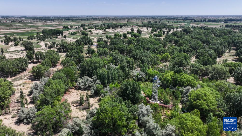 這是6月5日在巴彥淖爾市臨河區(qū)拍攝的郁郁蔥蔥的國(guó)營(yíng)新華林場(chǎng)(無人機(jī)照片)新華社記者 連振 攝