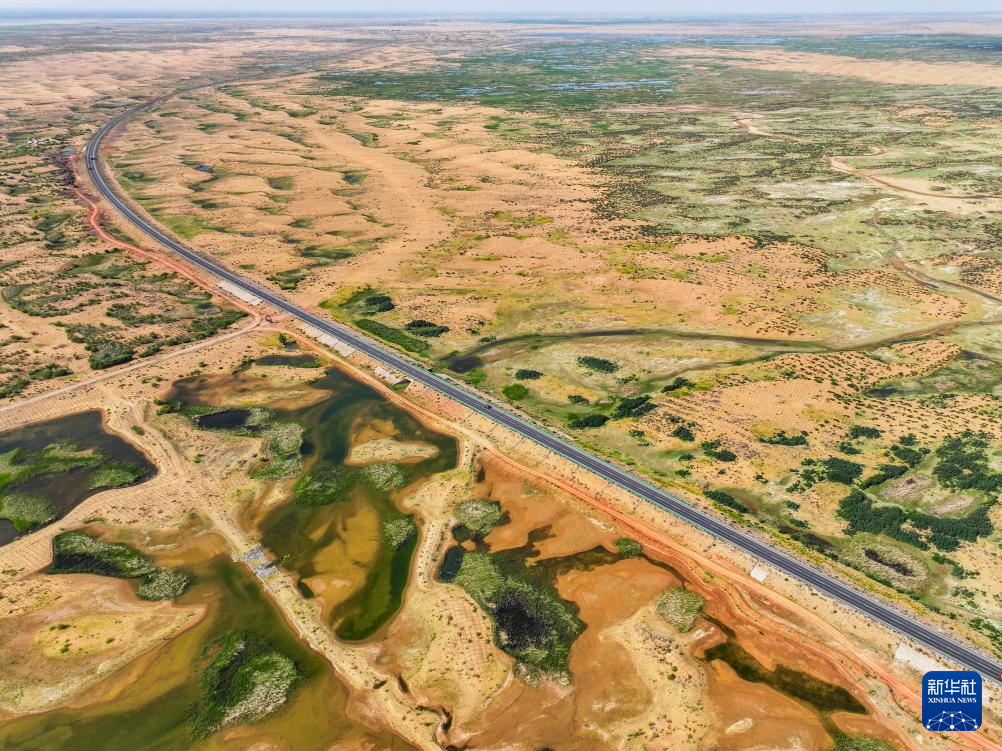 在鄂爾多斯市杭錦旗庫(kù)布其沙漠,穿沙公路兩側(cè)綠意蔥蘢(6月6日攝,無人機(jī)照片)新華社記者 連振 攝