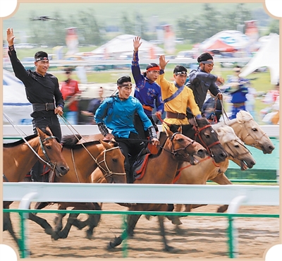 蒙古國馬術(shù)演員在2024年內(nèi)蒙古興安盟那達(dá)慕大會上表演。韓雙龍 攝