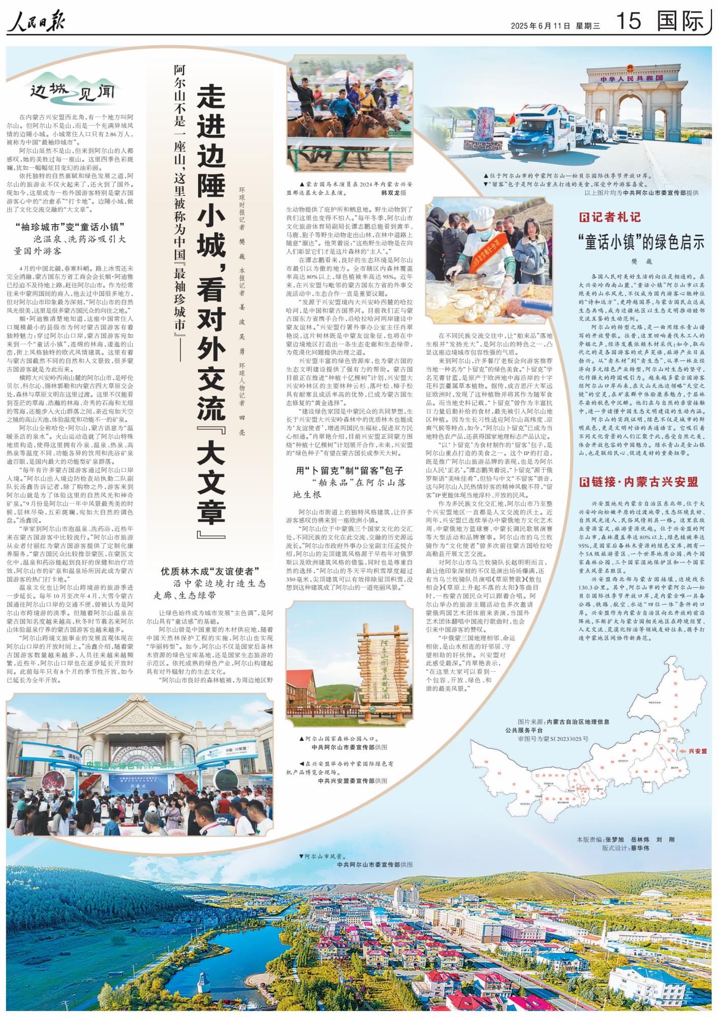 2025年6月11日,《人民日報(bào)》第15版刊發(fā)整版文章《阿爾山不是一座山,這里被稱為中國“最袖珍城市”——走進(jìn)邊陲小城,看對外交流“大文章”》,報(bào)道了依托獨(dú)特的自然稟賦和綠色發(fā)展之道,阿爾山的旅游業(yè)火起來了?,F(xiàn)如今,這里成為一些外國游客特別是蒙古國游客心中的“治愈系”“打卡地”。邊陲小城,做出了文化交流交融的“大文章”。