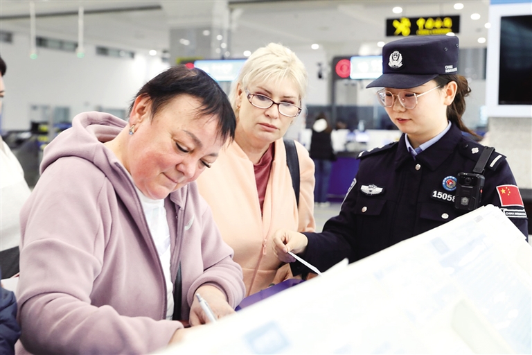 9月15日,滿洲里出入境邊防檢查站民警指導俄籍旅客填寫入境卡片。