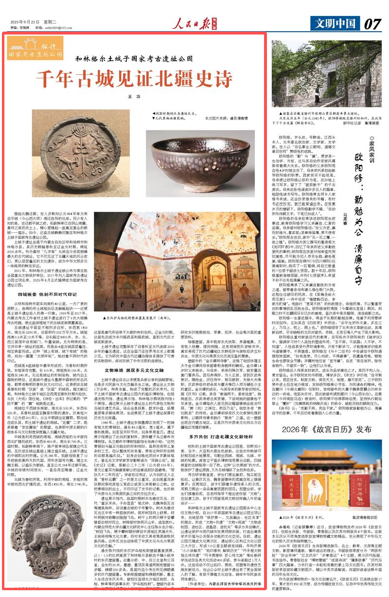 2025年9月23日,《人民日?qǐng)?bào)海外版》第7版刊發(fā)題為《和林格爾土城子國(guó)家考古遺址公園千年古城見(jiàn)證北疆史詩(shī)(探訪國(guó)家考古遺址公園)》的文章,報(bào)道了土城子遺址坐落于內(nèi)蒙古自治區(qū)呼和浩特市和林格爾縣,其歷史跨越春秋至遼金元時(shí)期,綿延2000余年。