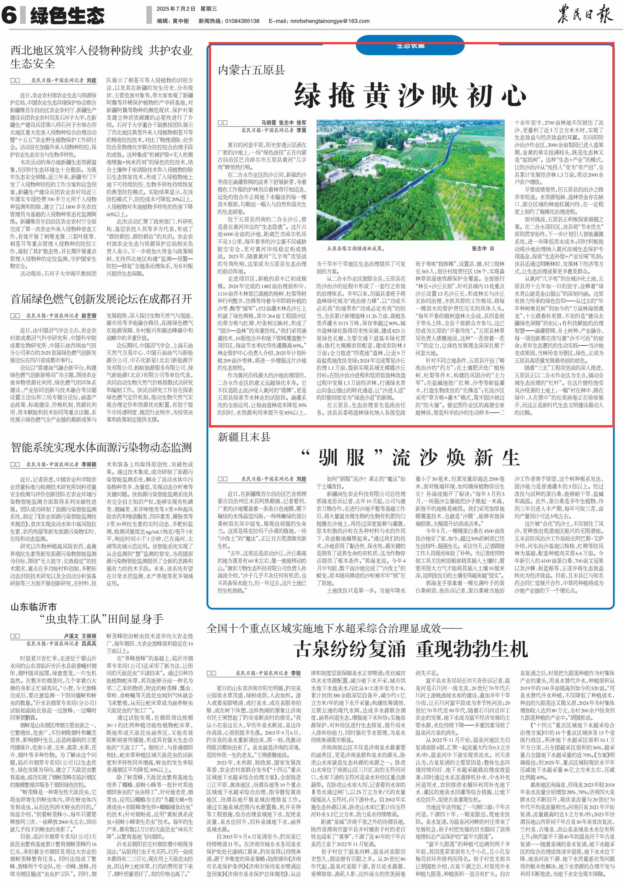 2025年7月2日《農(nóng)民日報(bào)》第6版刊發(fā)了《內(nèi)蒙古五原縣綠掩黃沙映初心》的文章,報(bào)道了從黃河“幾字彎”到全域沙化土地,內(nèi)蒙古自治區(qū)巴彥淖爾市五原縣用十五年如一日的堅(jiān)守,詮釋著“綠水青山就是金山銀山”的深刻內(nèi)涵。當(dāng)沙地變成果園,當(dāng)林場變?yōu)榫皡^(qū),綠色,正成為五原縣高質(zhì)量發(fā)展最亮麗的底色。