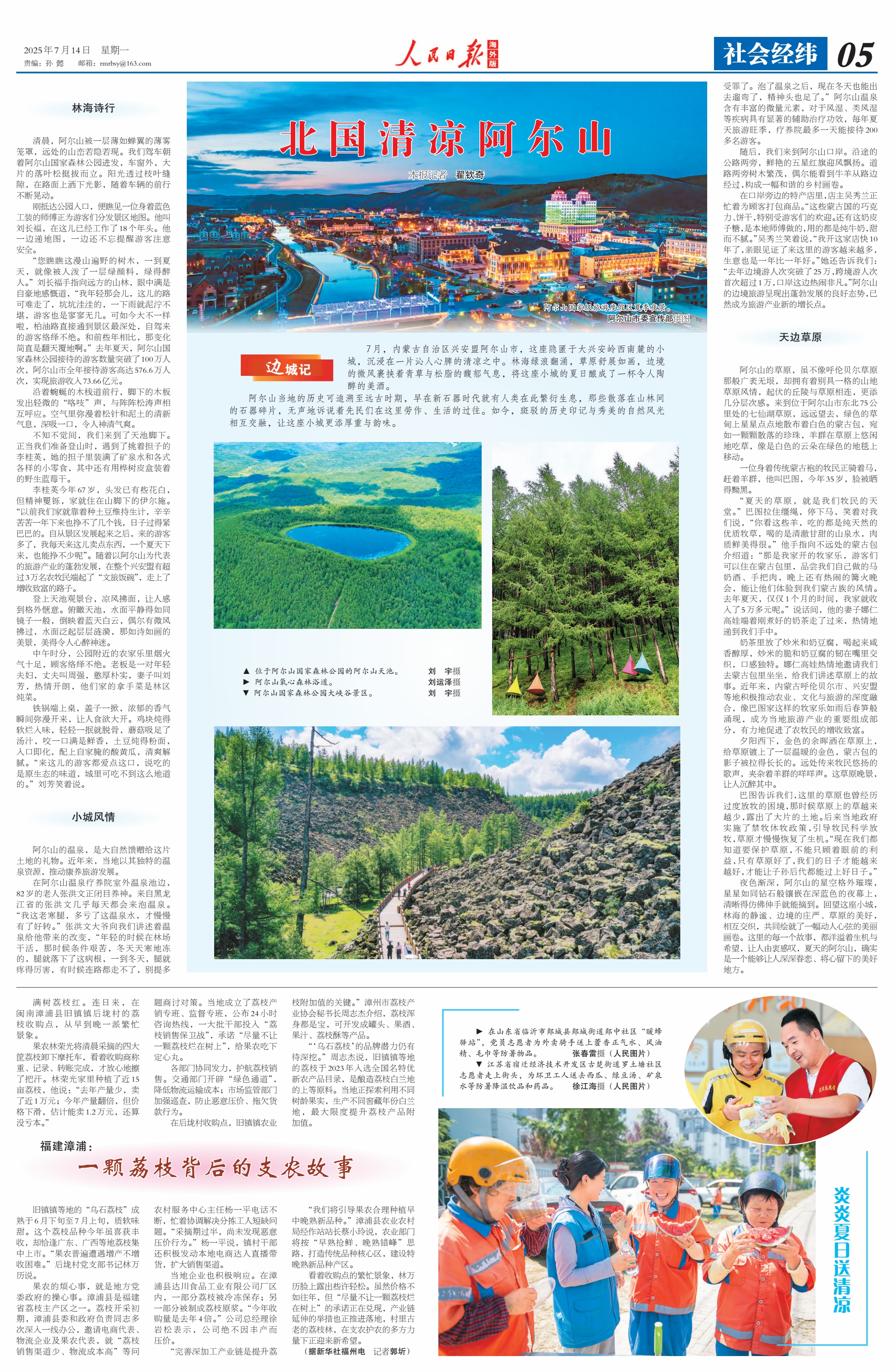 2025年7月14日《人民日報海外版》第5版刊發(fā)了題為《北國清涼阿爾山》的文章,報道了7月,內(nèi)蒙古自治區(qū)興安盟阿爾山市,這座隱匿于大興安嶺西南麓的小城,沉浸在一片沁人心脾的清涼之中。林海綠浪翻涌,草原舒展如畫,邊境的微風裹挾著青草與松脂的馥郁氣息,將這座小城的夏日釀成了一杯令人陶醉的美酒。