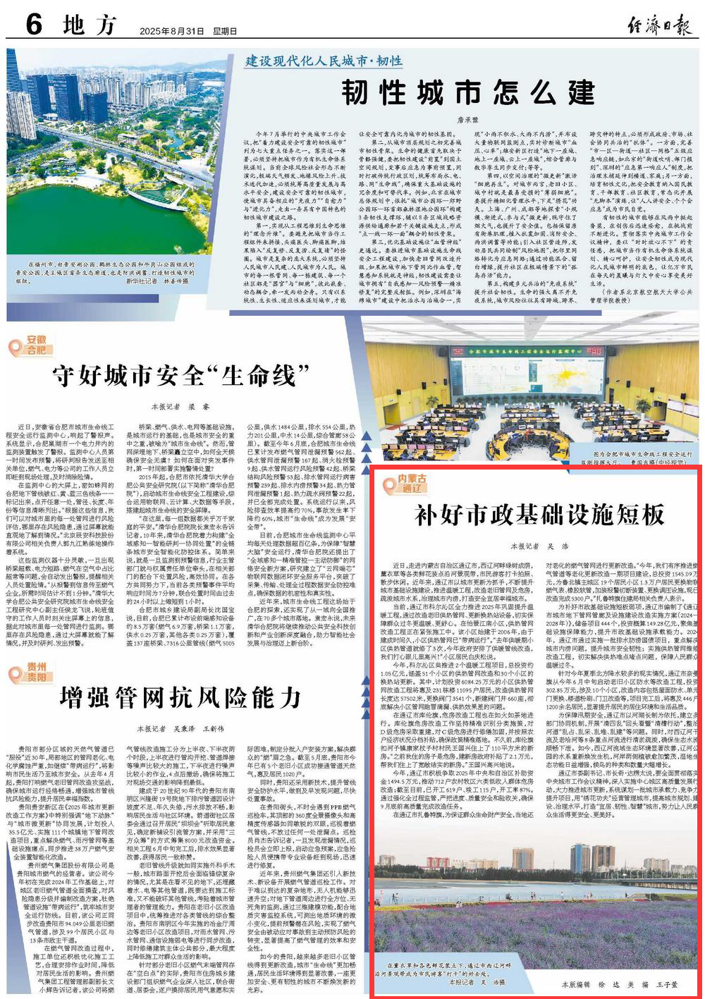 2025年8月31日,《經(jīng)濟(jì)日?qǐng)?bào)》第6版刊發(fā)題為《補(bǔ)好市政基礎(chǔ)設(shè)施短板》的文章,報(bào)道了近年來(lái),通遼市以城市更新為抓手,不斷提升城市基礎(chǔ)設(shè)施建設(shè),推進(jìn)溫暖工程,改造老舊管網(wǎng)及危房,疏浚城市水系,治理城市內(nèi)澇,打造安全宜居幸福城市。