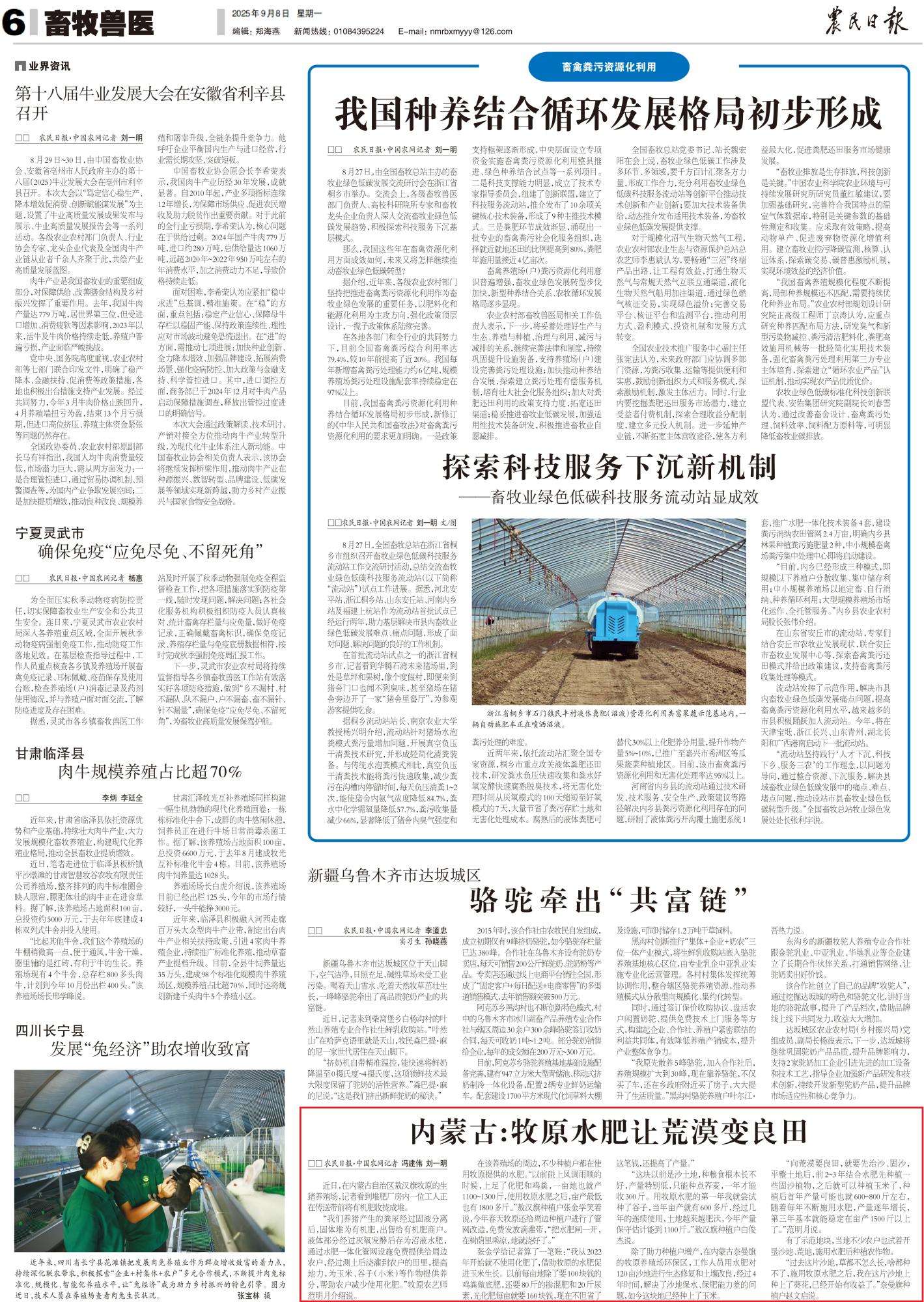 2025年9月8日,《農(nóng)民日?qǐng)?bào)》第6版整版刊發(fā)題為《內(nèi)蒙古:牧原水肥讓荒漠變良田》的文章,報(bào)道了在內(nèi)蒙古奈曼旗的牧原養(yǎng)殖場(chǎng)環(huán)保區(qū),工作人員用水肥對(duì)120畝沙地進(jìn)行生態(tài)修復(fù)和土壤改良,經(jīng)過(guò)4年時(shí)間,解決了沙地保水、保肥能力差的問(wèn)題,如今這塊地已經(jīng)種上了玉米。