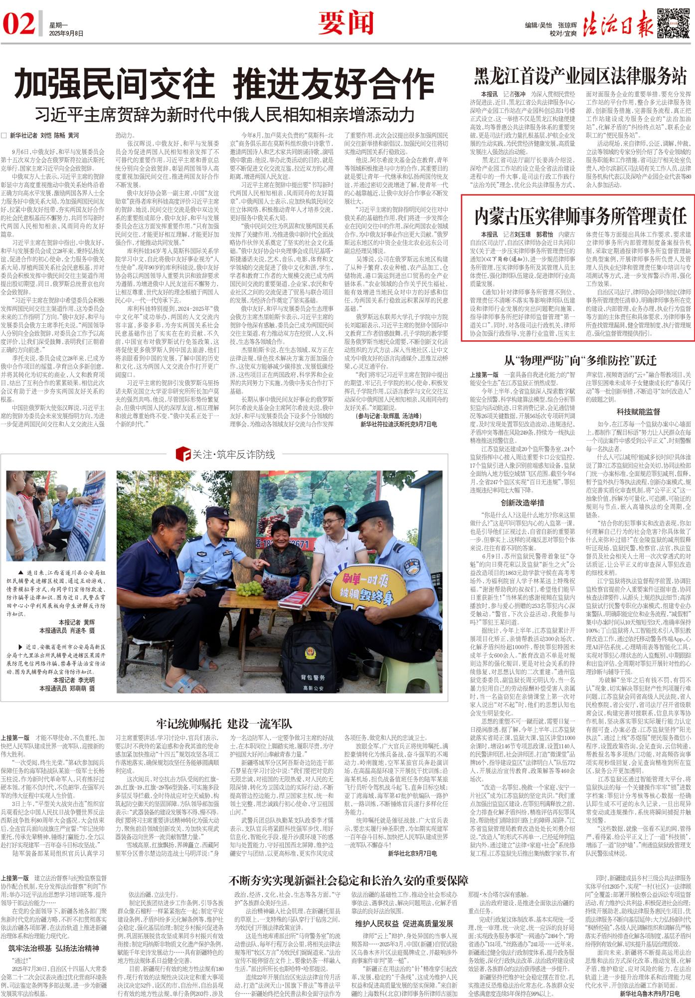 2025年9月8日,《法治日報》第2版整版刊發(fā)題為《內(nèi)蒙古壓實律師事務(wù)所管理責(zé)任》的文章,報道了內(nèi)蒙古自治區(qū)司法廳、自治區(qū)律師協(xié)會近日共同印發(fā)《關(guān)于進一步壓實律師事務(wù)所管理責(zé)任的通知》,進一步規(guī)范律師事務(wù)所管理,壓實律師事務(wù)所及其管理人員主體責(zé)任,強化律師隊伍建設(shè),促進律師行業(yè)高質(zhì)量發(fā)展。