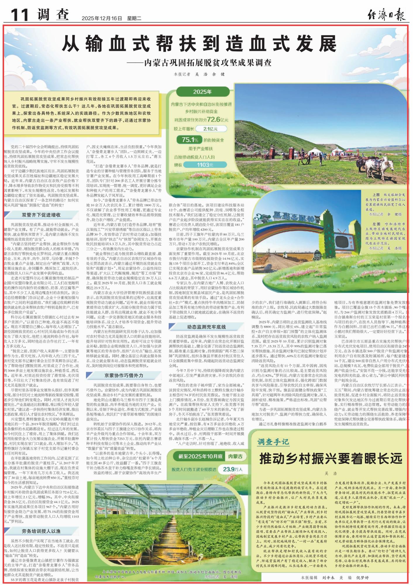 2025年12月16日,《經(jīng)濟(jì)日?qǐng)?bào)》第11版刊發(fā)題為《從輸血式幫扶到造血式發(fā)展——內(nèi)蒙古鞏固拓展脫貧攻堅(jiān)成果調(diào)查》的文章,報(bào)道了鞏固拓展脫貧攻堅(jiān)成果同鄉(xiāng)村振興有效銜接五年過(guò)渡期即將迎來(lái)收官。作為少數(shù)民族地區(qū)和農(nóng)牧地區(qū),內(nèi)蒙古走出一條產(chǎn)業(yè)幫扶、就業(yè)幫扶雙管齊下的路子,還通過(guò)京蒙協(xié)作機(jī)制、防返貧監(jiān)測(cè)等方式,有效鞏固拓展脫貧攻堅(jiān)成果。
