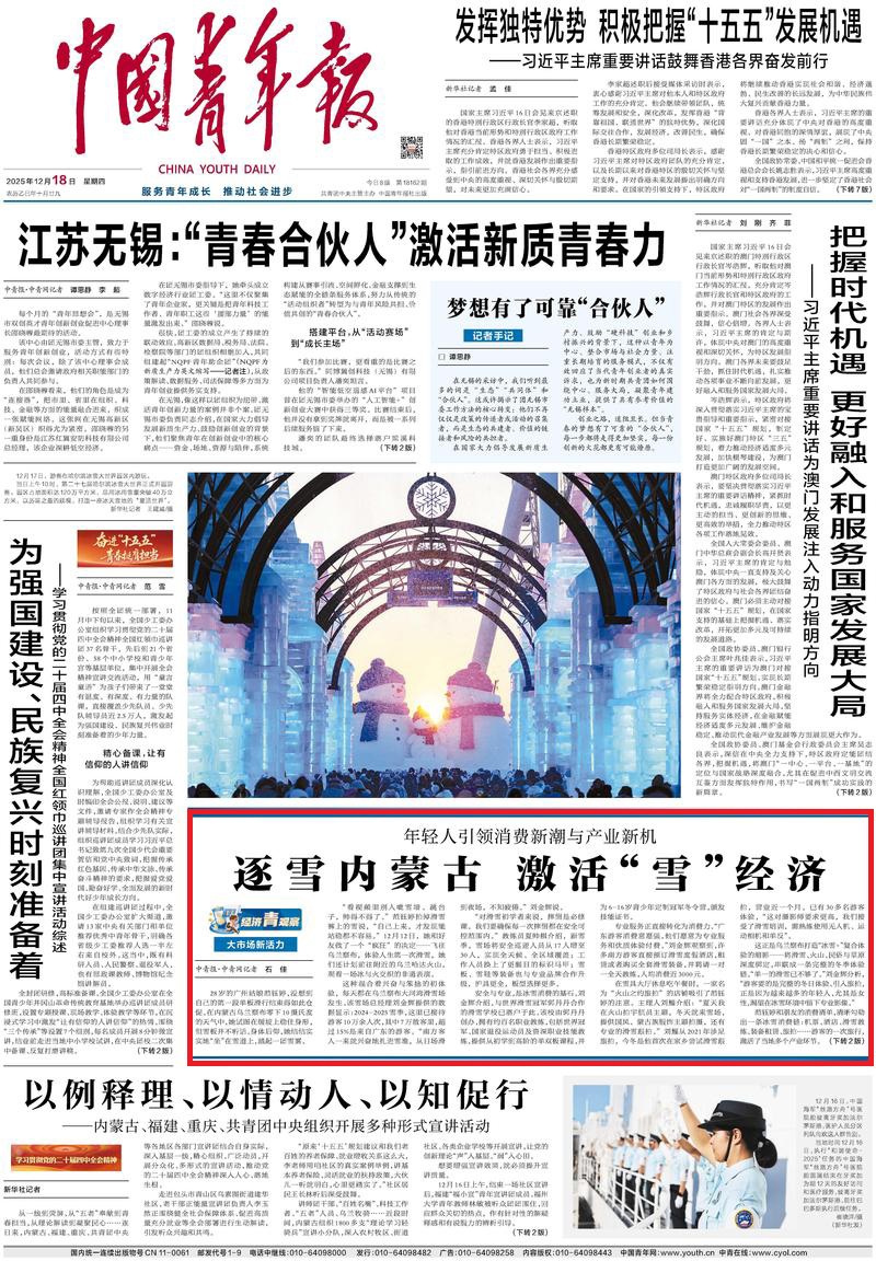 2025年12月18日《中國青年報》第1版刊發(fā)了《大市場新活力 年輕人引領(lǐng)消費新潮與產(chǎn)業(yè)新機 逐雪內(nèi)蒙古 激活“雪”經(jīng)濟》的文章,報道了烏蘭察布大河灣滑雪場是打造“冰雪+”復(fù)合體驗的縮影——將滑雪、火山、民俗與草原深度綁定,串聯(lián)成一條完整的冬季體驗鏈。