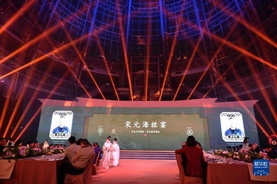 當(dāng)日,福建泉州石獅市舉辦“閩菜地標(biāo)美食城市”授牌暨“宋元海絲宴”推介儀式?!八卧=z宴”以南宋福建泉州石獅籍美食家林洪著作《山家清供》為還原藍(lán)本,兼收閩南名菜,集山珍、海味于一席,將菜品、宴席與宋元器皿、場(chǎng)景、樂(lè)曲、詩(shī)詞等融合,展現(xiàn)宋元時(shí)期世界海洋商貿(mào)中心獨(dú)特的美食文化。新華社記者 魏培全 攝