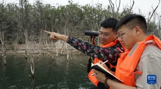 北京市水務局密云水庫管理處水生態(tài)管護員在觀察和記錄候鳥育雛情況(5月31日攝)。
