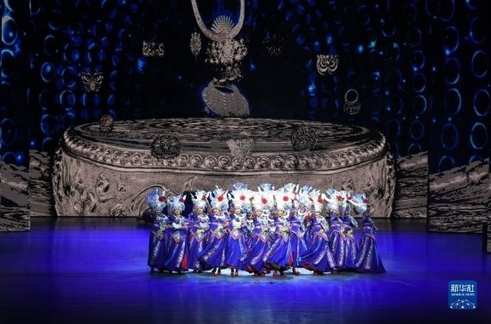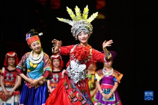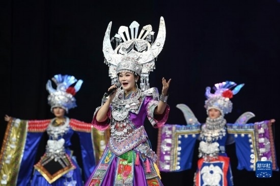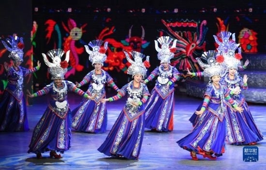6月5日,演員在貴陽大劇院的《多彩貴州風》演出中表演節(jié)目《金繡銀飾》。
