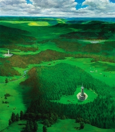 河北塞罕壩林場,是“三北”工程建設(shè)的重要區(qū)域。荒原變林海的塞罕壩奇跡,成為近年來主題性美術(shù)創(chuàng)作的重要課題。入選“筑夢——我們的新時代美術(shù)攝影作品展”的譚智群油畫《美麗的塞罕壩》,是在實地寫生基礎(chǔ)上的藝術(shù)提煉和情感升華。作者以俯視的構(gòu)圖,鋪展?jié)M目蒼翠的美景。畫面左側(cè),清澈的河流蜿蜒向前;畫面右側(cè),白色的雁群逐綠翱翔;遠(yuǎn)方,茂密的森林不斷延伸,風(fēng)力發(fā)電機林立于山巔,畫面充滿生機與活力。同樣以俯視的角度處理構(gòu)圖,孔亮油畫《美麗中國——塞罕壩》則以塞罕壩林場和塞罕塔為視覺中心,蔥蘢的綠意,將意境渲染得更加深邃。翁凱旋油畫《滄海桑田——塞罕壩的前世今生》,通過三聯(lián)畫的形式,在新舊對比中構(gòu)建時空長廊,描繪出塞罕壩的時代變遷。
