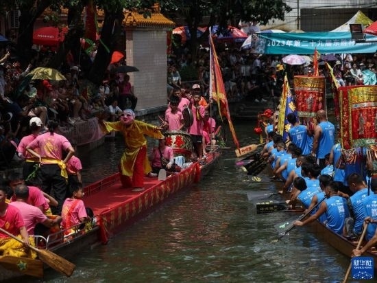這是佛山疊滘端午龍船漂移賽開始前的龍船巡游(6月22日攝)。